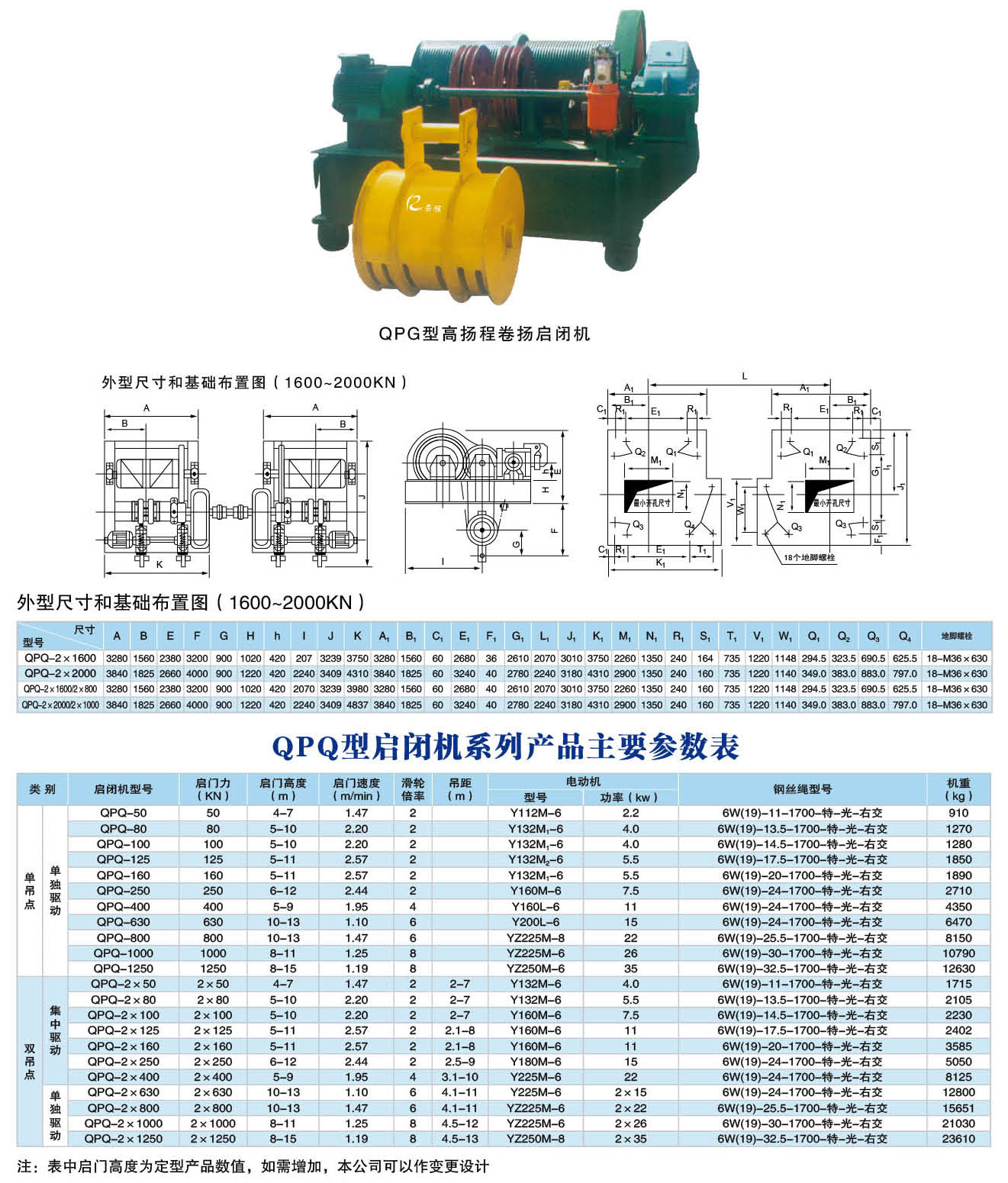 新河縣榮程水利機械廠卷揚啟閉機有多種型號:可以分為QPQ型普通卷揚啟閉機、QPK型快速卷揚啟閉機、QPG型高揚程卷揚啟閉機、QPT型臺車式卷揚啟閉機,QPM型門式卷揚啟閉機,QH型弧門卷揚啟閉機。卷揚啟閉機又分為:平門卷揚式啟閉機;弧形門卷揚式啟閉機;雙吊點卷揚式啟閉機;快速卷揚式啟閉機;移動式臺車啟閉機;雙吊點卷揚式啟閉機分為:集中驅動和單獨驅動兩種;卷揚式啟閉機手搖、電動兩用式規(guī)格分為:5噸、8噸、12噸、16噸、25噸;電動式規(guī)格分為:40噸、63噸、80噸、100噸、125噸、160噸、200噸,可以根據(jù)用戶要求設計,并能生產雙吊點卷揚式啟閉機,該機是一種水利工程專用機械,廣泛用于水利工程閘門的啟閉,是農田灌溉、水產養(yǎng)殖、農業(yè)經(jīng)濟開發(fā)區(qū)、污水處理廠、水利發(fā)電站、水庫(水閘、堤壩、隧道、管 道)等進水、退水閘的配套機械,山區(qū)、平原有、無電地區(qū)均可使用。