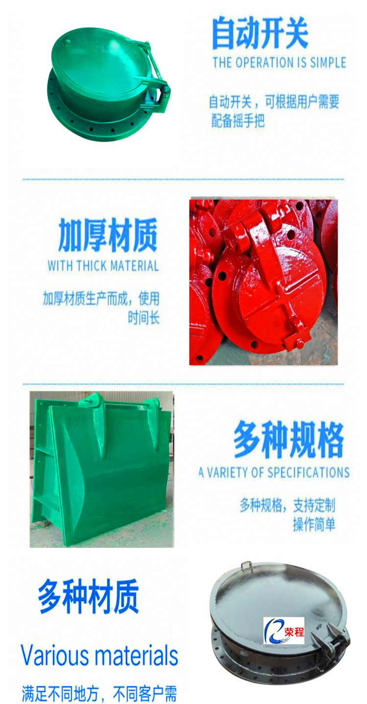 具有流道正向單向開啟和反向關閉的作用。配重式拍門借助于配重的平衡作用,在水流的作用下使門頁自動開啟或關閉,或稍加外力作用使門頁開啟或關閉;浮箱式拍門則利用門頁在水中的浮力,在水流的作用下使門頁開啟或關閉。